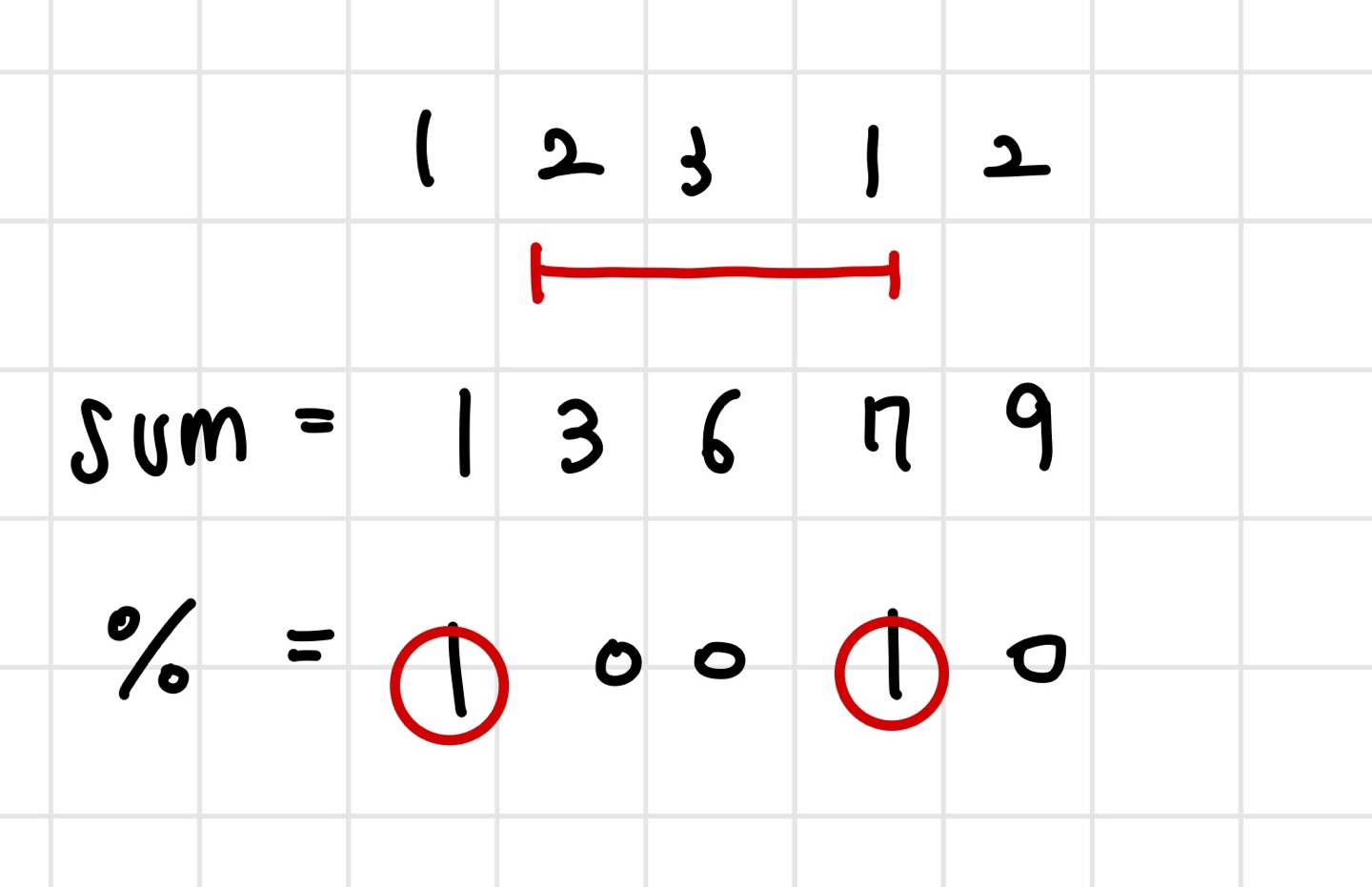 우선 배열 [1,2,3,1,2]의 누적합 배열은 [1,3,6,7,9]이다.