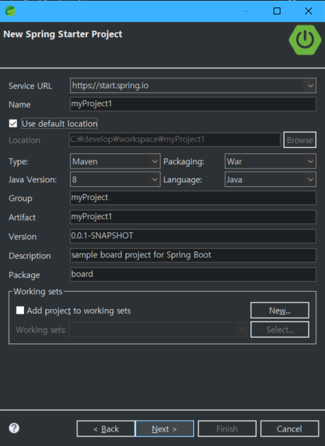 우선 위에서와 같이 Spring Boot에서 프로젝트를 하나 생성한다. (workspace를 지정한 뒤 폴더를 만들어 그곳에 저장한다.)