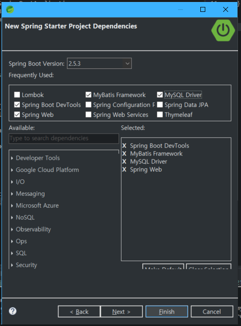 - 나는 Spring Boot DevTools, MyBatis Framework, MySQL Driver, Sping Web 이렇게 4개의 의존성을 세팅하였다.