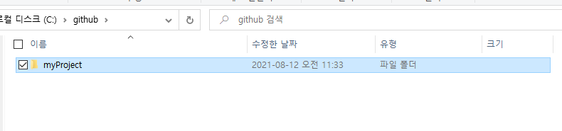 나는 로컬 디스크에 github라는 폴더를 만들고 그 안에 myProject 폴더를 하나 더 생성하였다.