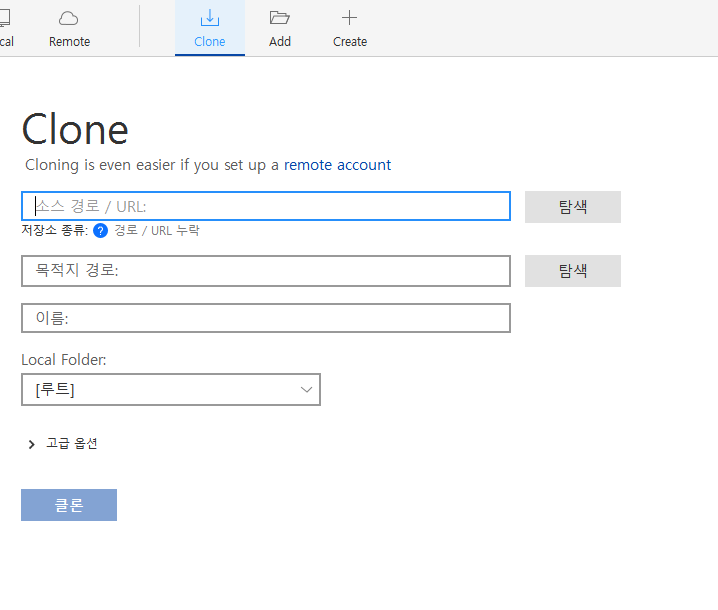 *이 방법은 github에 먼저 repository를 생성하였을 때 소스트리와 연동하는 방법이다. 즉, clone을 사용하였는데 보통 이미 만들어진 프로젝트 개발에 참여할 경우 git clone을 사용하기 때문에 직접 프로젝트 생성 시에는 git init을 사용하는 것이 편리하다. (밑에 추가하였다.)
