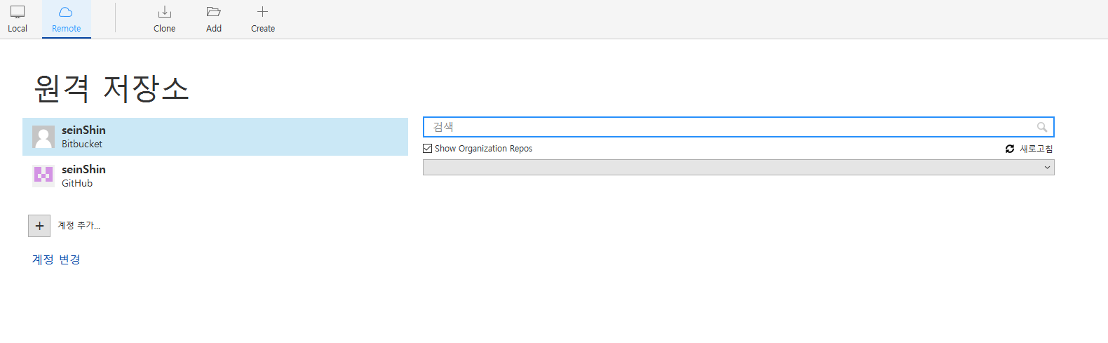 우선, New tab -> Remote -> 계정 추가 를 누른 후 호스팅 서비스를 GitHub으로 바꿔준다.