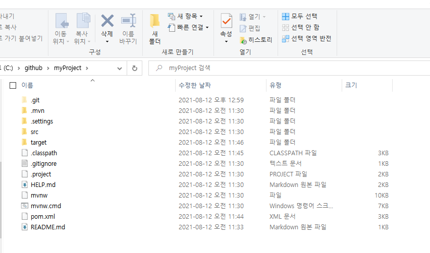 ※ 이때, 순서가 꼬여서 깃헙 경로로 설정한 폴더에 파일이 생기거나 스프링부트에서 프로젝트 생성 시 사용하는 경로에 git파일이 생긴다면 전자의 경우 소스트리 clone이 후자의 경우 선택한 경로에 프로젝트 생성이 불가하니 반드시 순서를 지켜야 한다. (바로 위에서 다른 방법을 추천한다고 했던 이유이다..ㅠ)